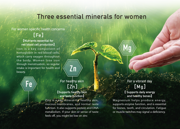 Three essential minerals for women's beauty and health: iron, zinc, and magnesium.