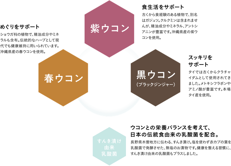さらに、それぞれ異なる特徴を持つ3種のウコンと、植物由来乳酸菌もオリジナルで配合しています。