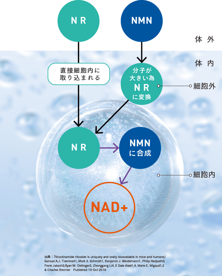NMNは体内でNAD+という成分に変換され、美しく、イキイキと生きるためのエネルギーを作り出しますが、