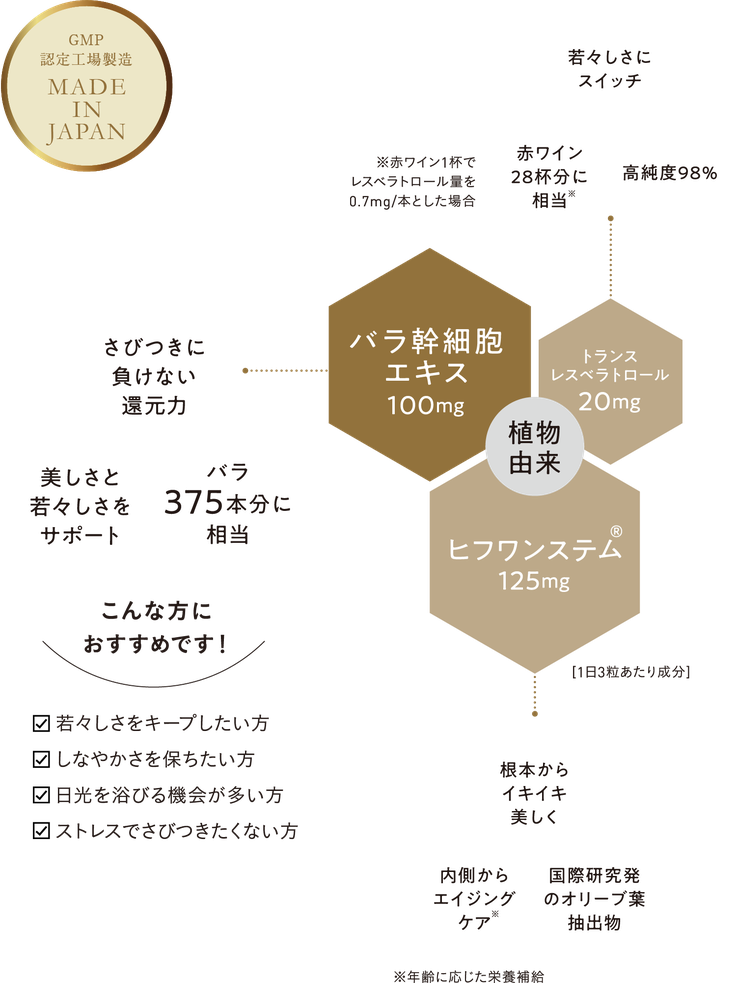 バラ幹細胞エキスの美容パワーに加えて、注目成分・ヒフワンステム®(特殊なオリーブ葉由来)と